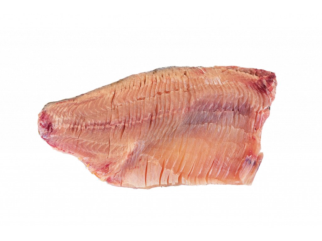 Filet s kůží, bez okrajové břišní partie a se strojně prořezanými svalovými kůstkami.
